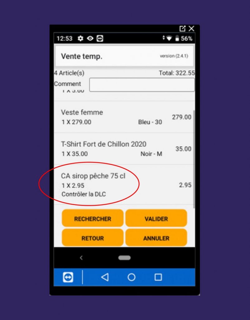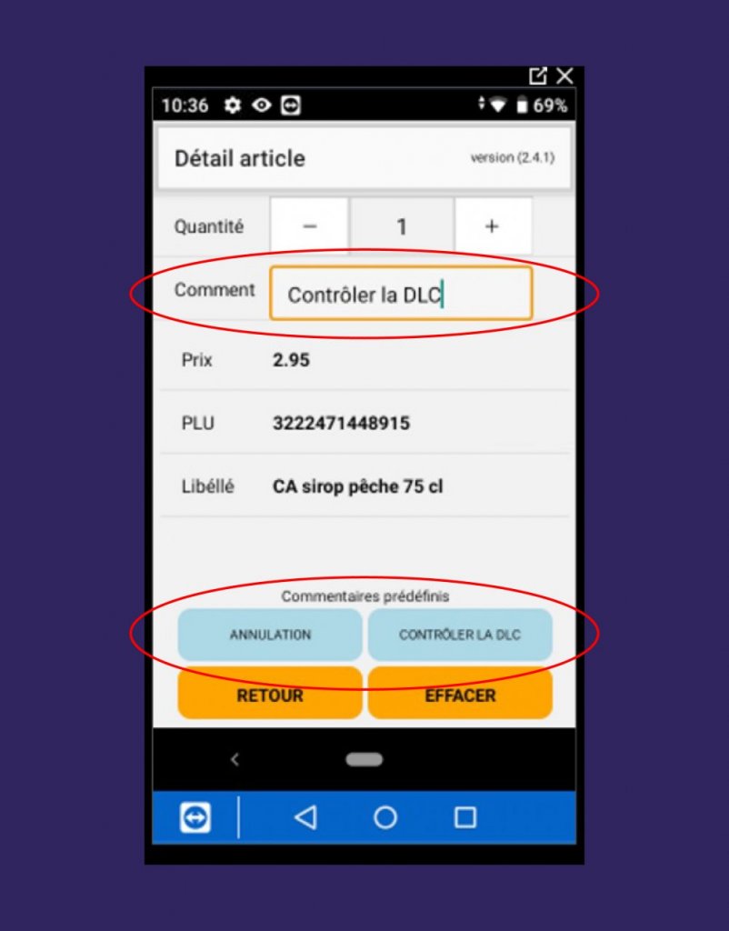 Grâce à la fonction « commentaire », vous pouvez indiquer un texte lors de chaque saisie d’un produit, tel que « Contrôler la date limite de vente (DLC) ».