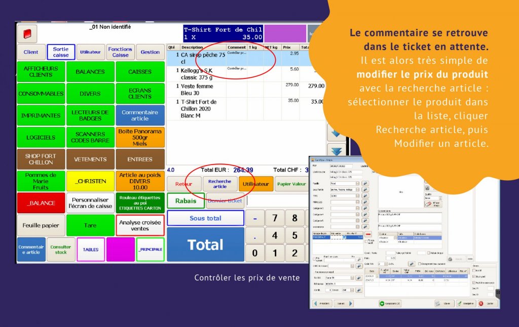 En appuyant sur le bouton adéquat, le texte s'ajoute à la ligne de l'article et apparaît sur le ticket en attente à la caisse ou sur un poste de back-office. Le ticket peut ensuite être imprimé ou simplement sélectionner les articles commentés.